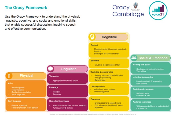 Our Oracy curriculum is underpinned by the Oracy Framework created by Voice 21. The Oracy framework uses four vital strands; physical, linguistic, cognitive, social and emotional.